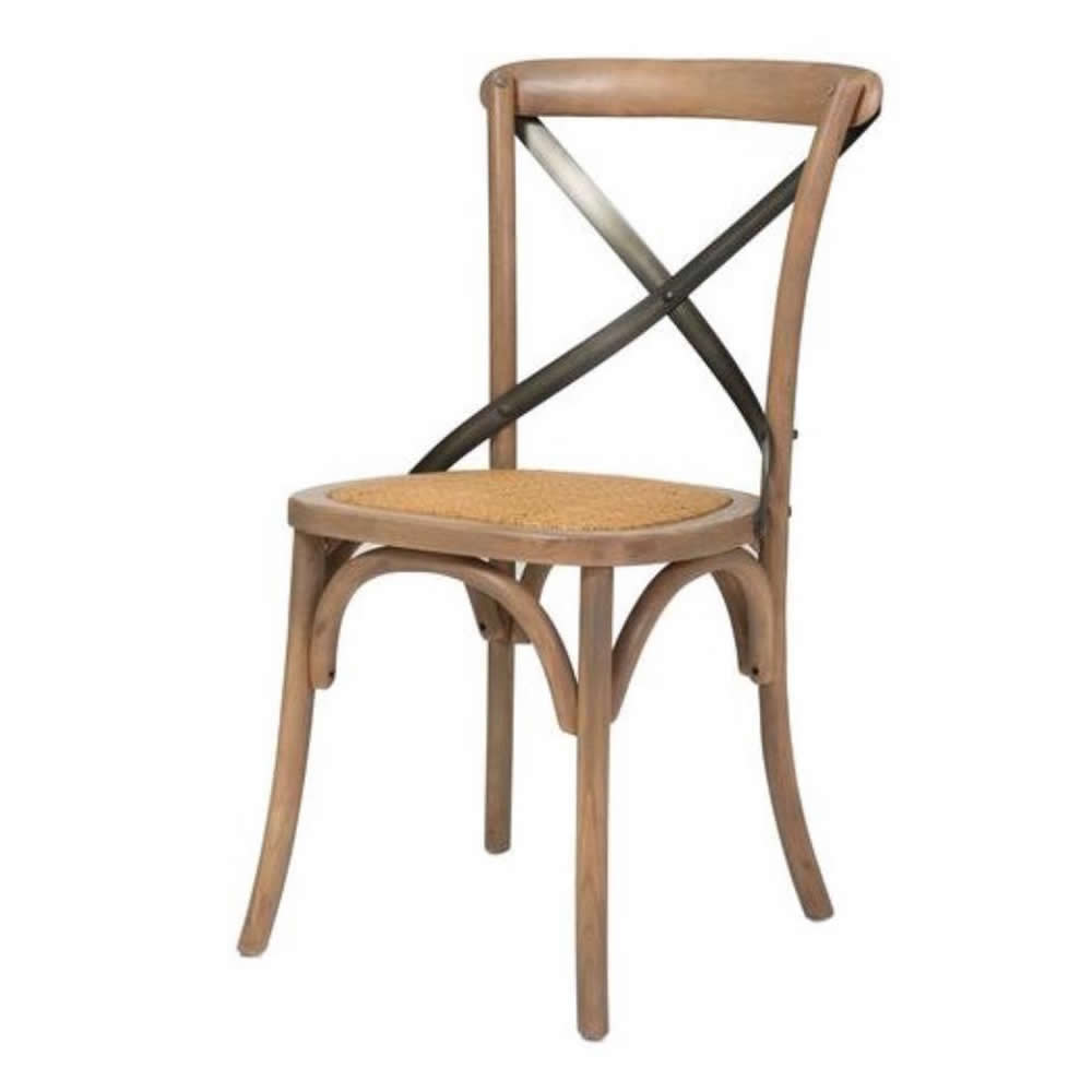 Based on classic French bistro chairs, our solid wood Cross Back chairs are light and airy yet sturdy. They feature rustic metal cross pieces and natural cane woven seats and come in a rustic weathered finish.