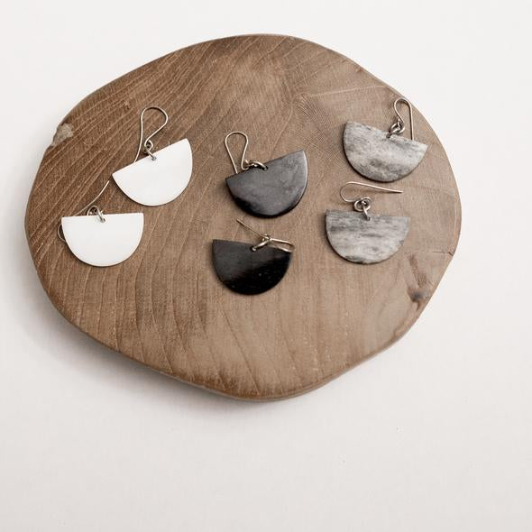 These half moon shaped earrings made in Kibera slums, Kenya are made from recycled bone (white or grey) or cowhorn (black).