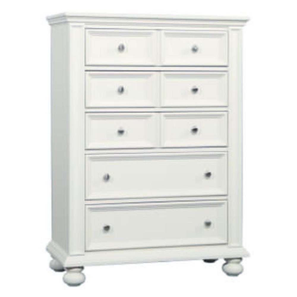 The Farmhouse Bay Five Drawer Chest provides ample storage with five spacious drawers with a painted smooth white finish. Simple lines and bead board details give this chest a vintage feel.