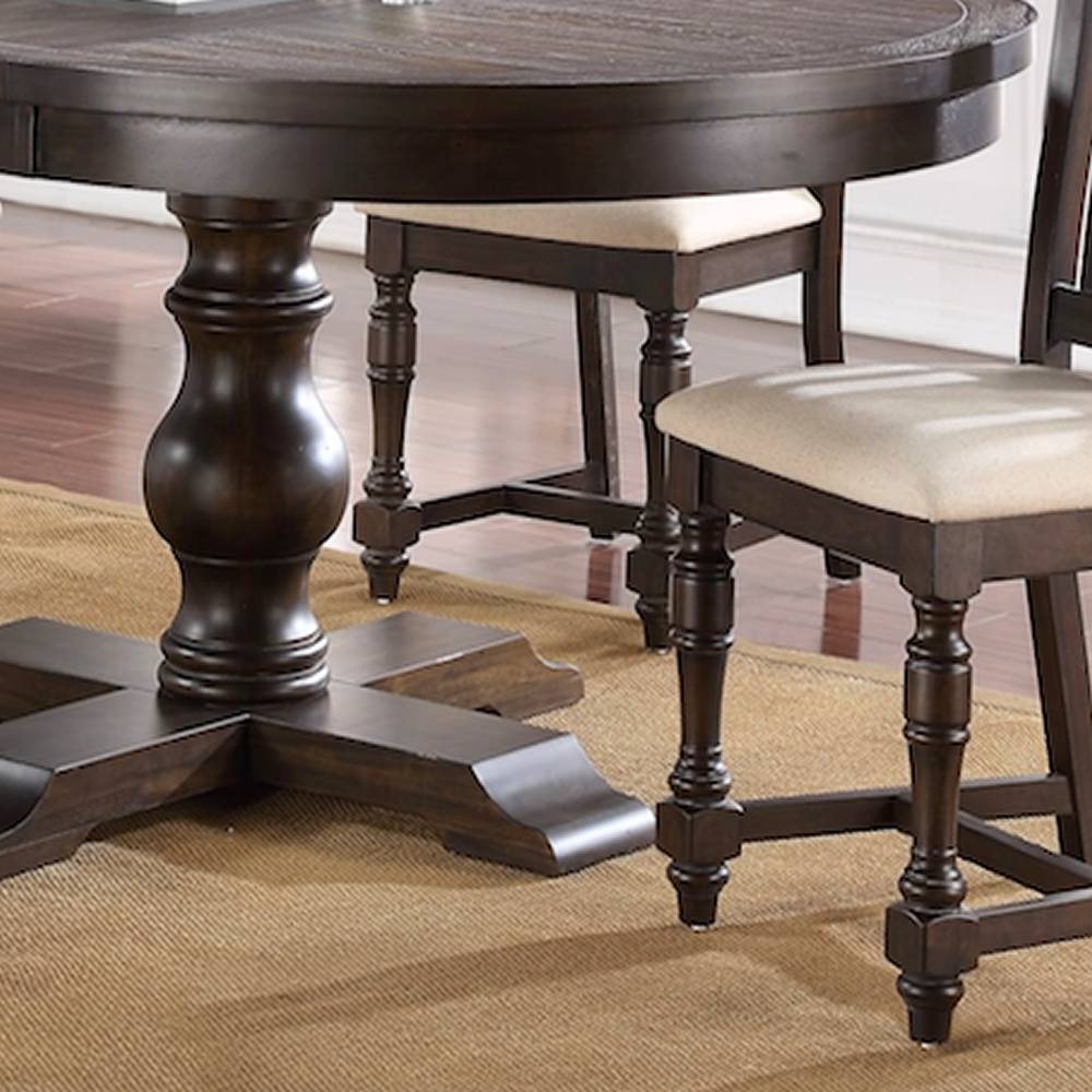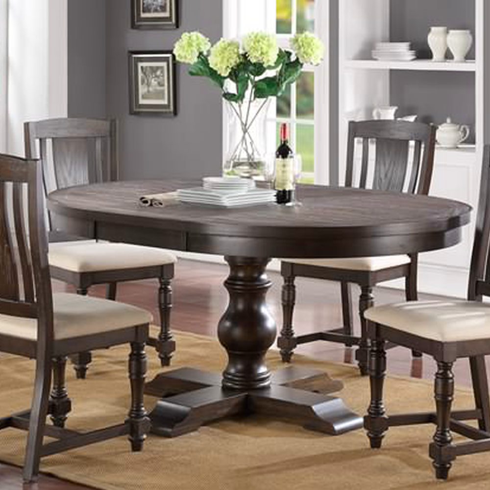 An elegant round dining table that comes with a leaf to enlarge the table into an oval allows flexibility with timeless style.