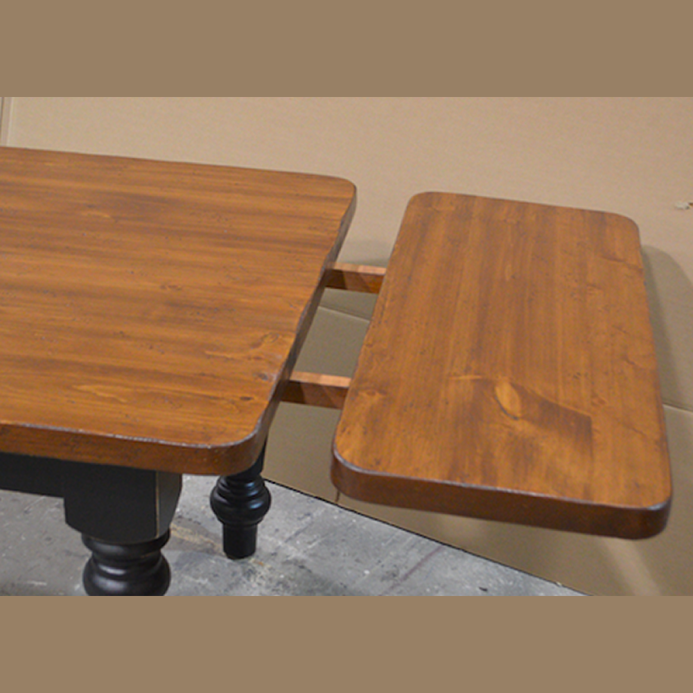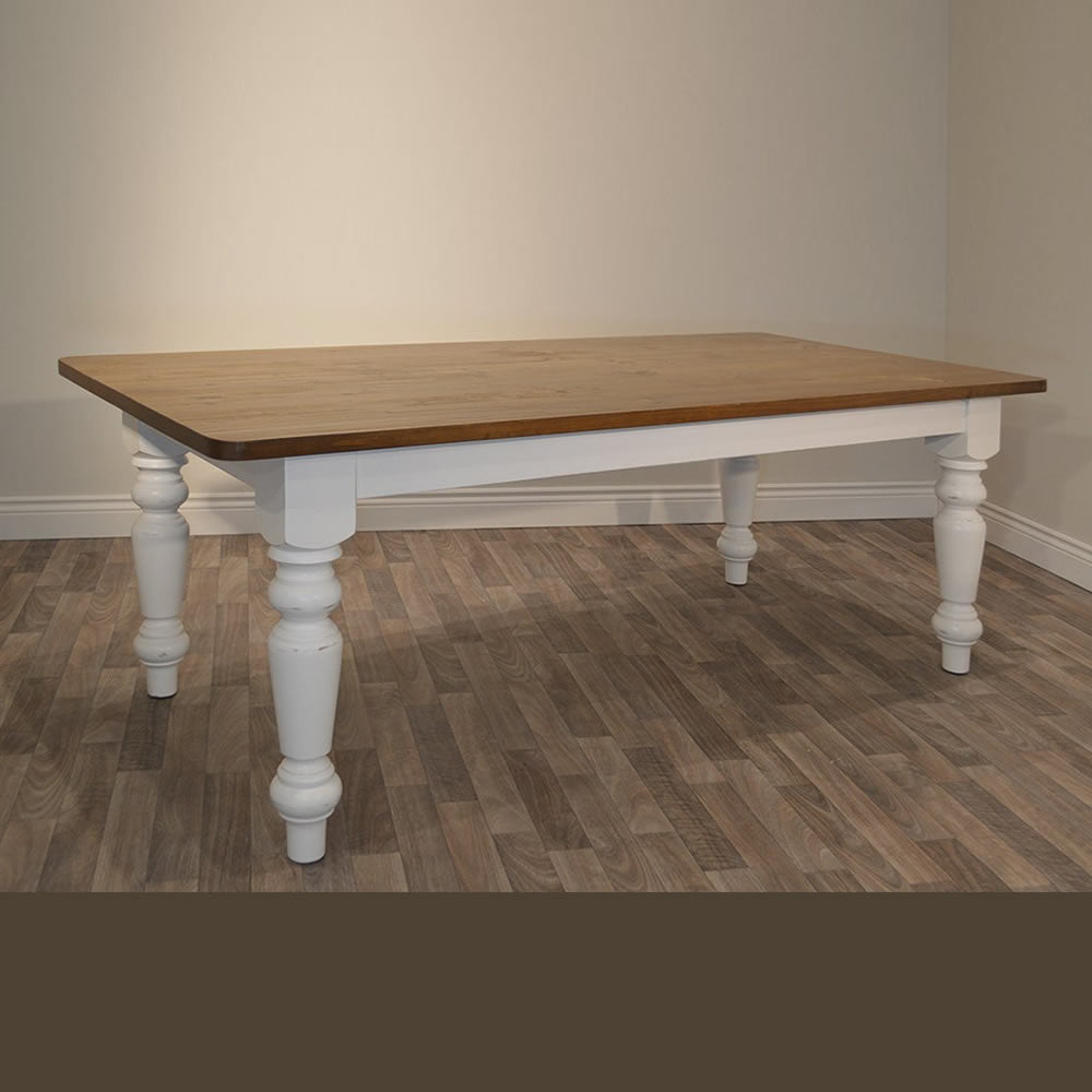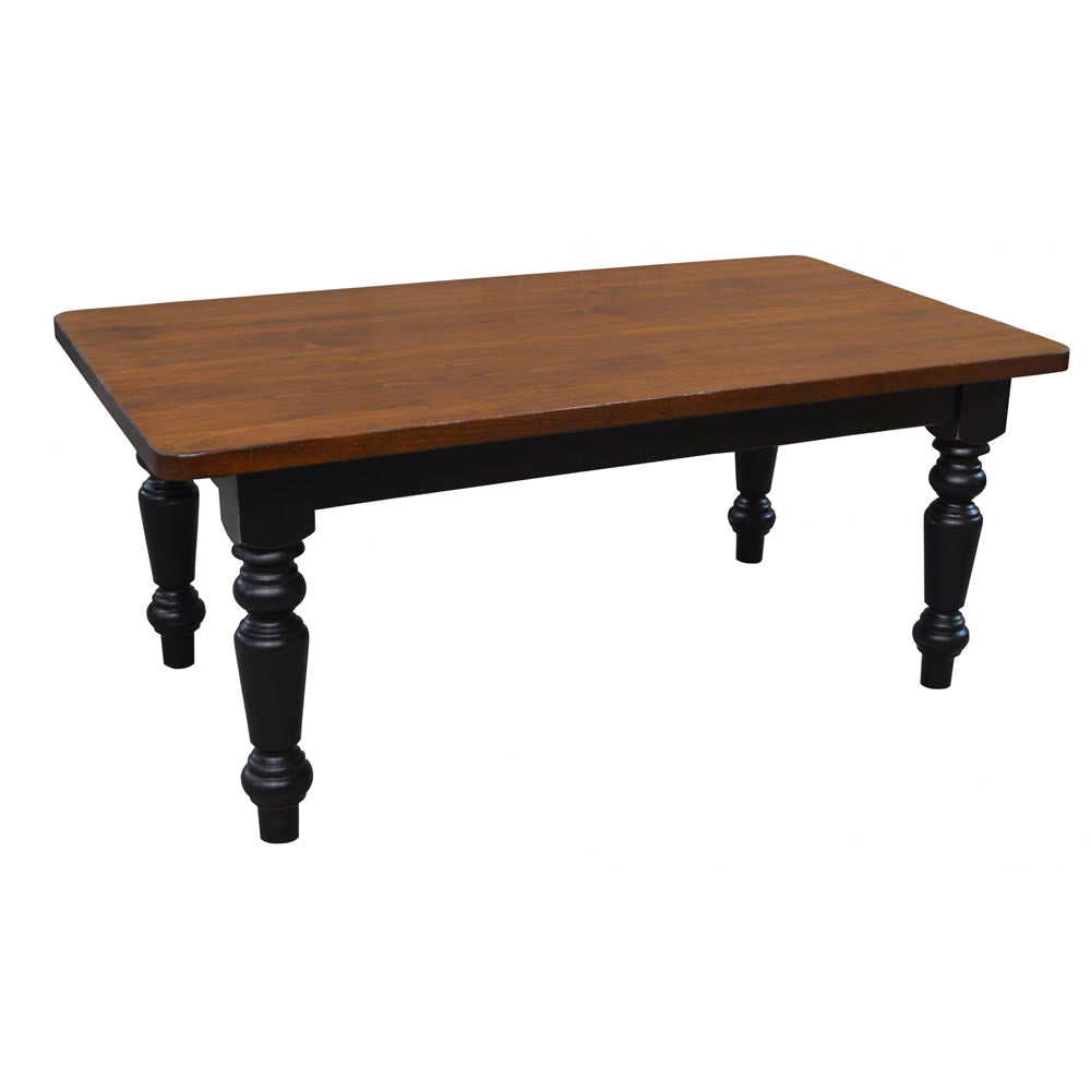 The Sugar Hill Harvest Table's traditional farmhouse styling lends itself to large and small applications. The legs are turned from 5” square solid blocks of Canadian maple and the standard top is 1 1/8” thick white pine. The top on the harvest table is hand-planed for a rustic farmhouse feel. The top can have a contrasting finish to the base with stain and paint samples available to see in store.