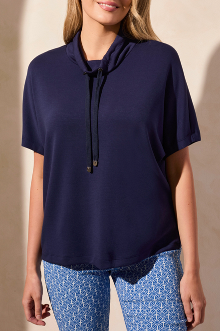 Short Sleeve Funnel Neck Top with Draw Cord, Navy