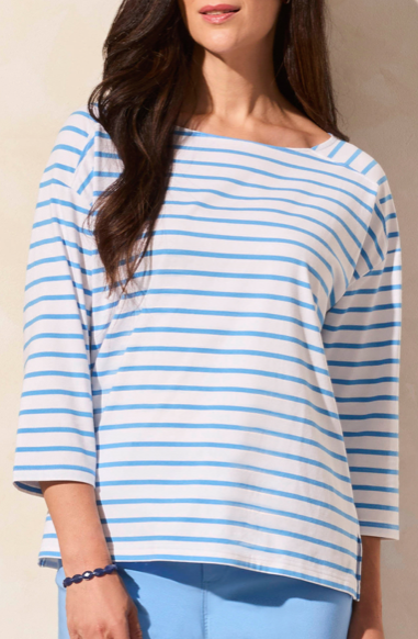3/4 Sleeve Boat Neck Top Blue & White Stripe