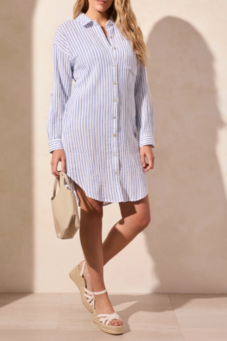 Long Sleeve Loose Button Down Shirt, Blue Stripe