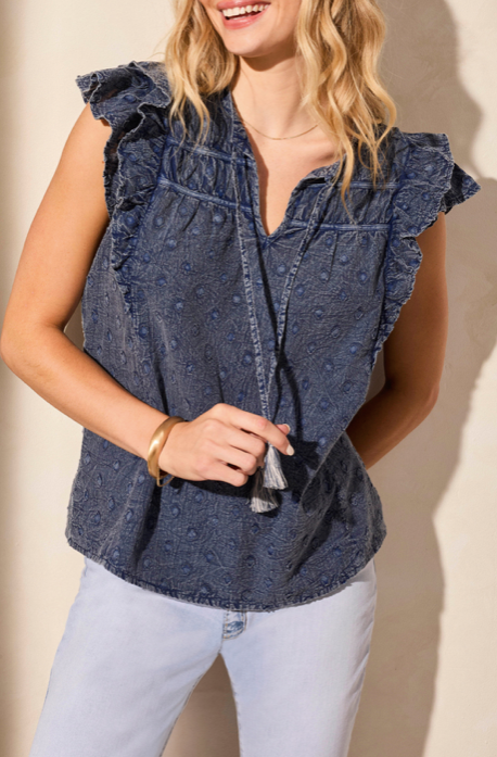Tie-Front Blouse with Frilled Sleve, Blue Stripe