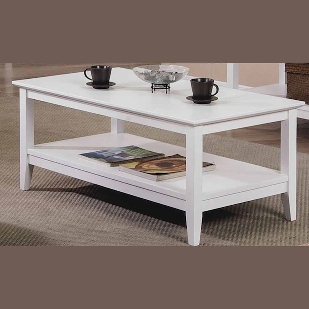 Clean and simple, this coffee table comes with a smooth white sprayed finish and elegantl tapered feet. A lower shelf provides extra storage and looks great with baskets tucked beneath.
