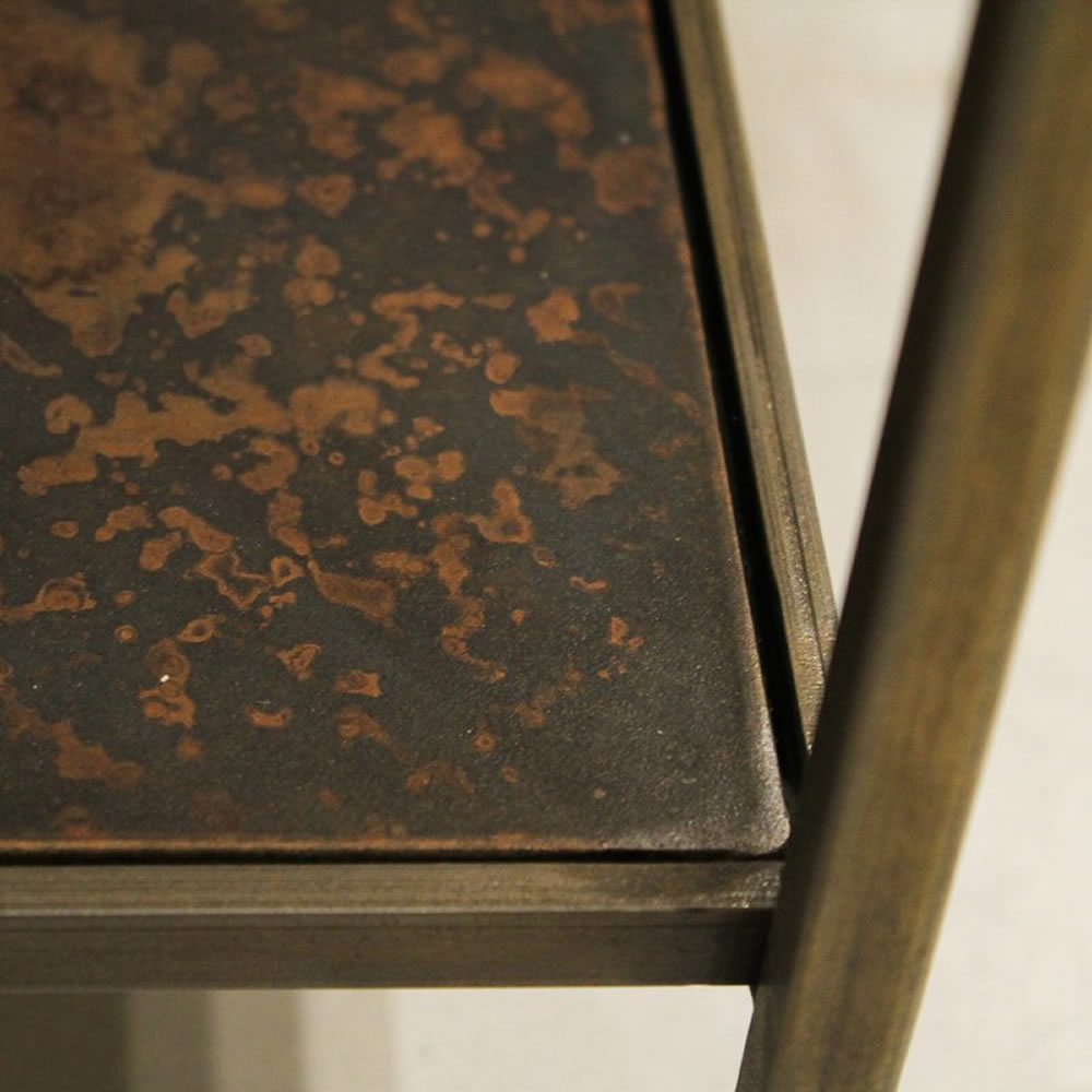 10mm thick tempered glass top. Distressed metal bottom.