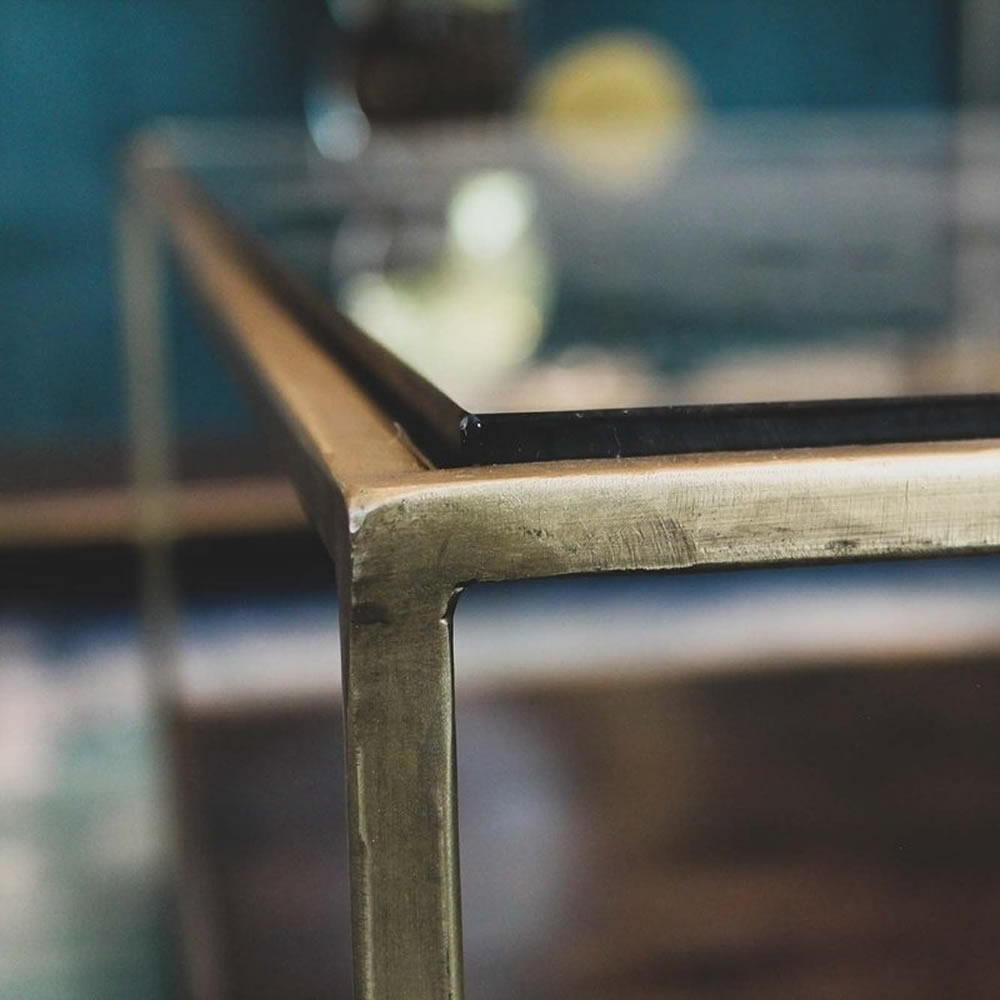 The perfect blend of modern and classic, elegant and rustic, the Venus coffee table is the go-anywhere chameleon that works with many design styles. With thin and airy legs plus a glass top, the Venus doesn't eat up visual space. The antiqued brass finish coupled with the distressed metal base give this table some edge.