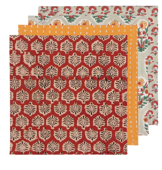 Each napkin is created individually by hand using wooden block print stamps, resulting in truly unique pieces. Each set of four includes one each of four separate patterns in shades of marigold, rust and emerald green.