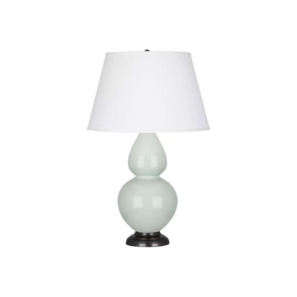 Celadon glazed ceramic with deep patina bronze finished accents double gourd table lamp with pearl dupioni fabric shade . Our double gourd collection features a simple but gracefully curving silhouette. Available in a wide array of vibrant colors.