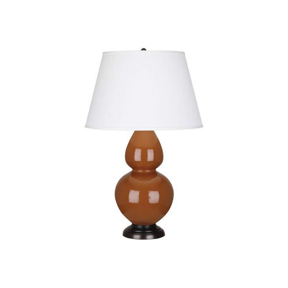 Cinnamon glazed ceramic with deep patina bronze finished accents double gourd table lamp with pearl dupioni fabric shade . Our double gourd collection features a simple but gracefully curving silhouette. Available in a wide array of vibrant colors.