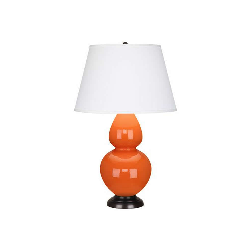 Pumpkin glazed ceramic with deep patina bronze finished accents double gourd table lamp with pearl dupioni fabric shade . Our double gourd collection features a simple but gracefully curving silhouette. Available in a wide array of vibrant colors.