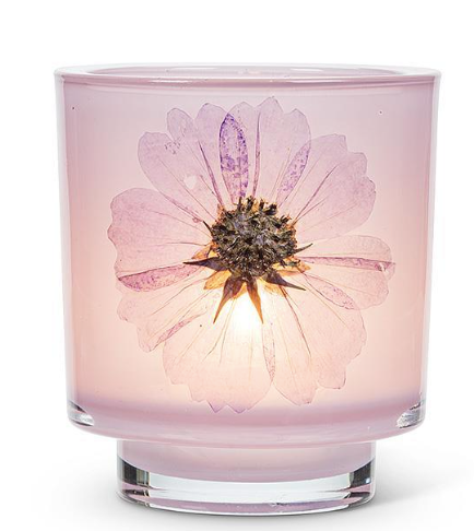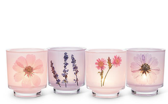 Enhance the ambiance anywhere with these subtle yet eye-catching Frosted Votive Candle Holders with Pressed Flowers. Crafted out of glass and available in four assorted styles, each of these frosted votive holders is accented with a gorgeous pressed-flower motif at centre – a unique, understated complement to flickering votive candlelight.